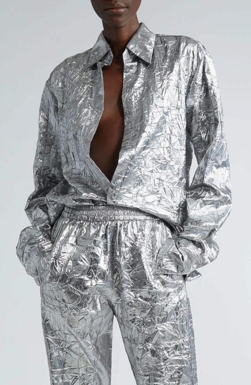 Textured metallic fabrics are having their moment this fashion week, both as the entire outfit and also in fun pops of crinkly “alfoil” textures to accompany pared-back tailoring.