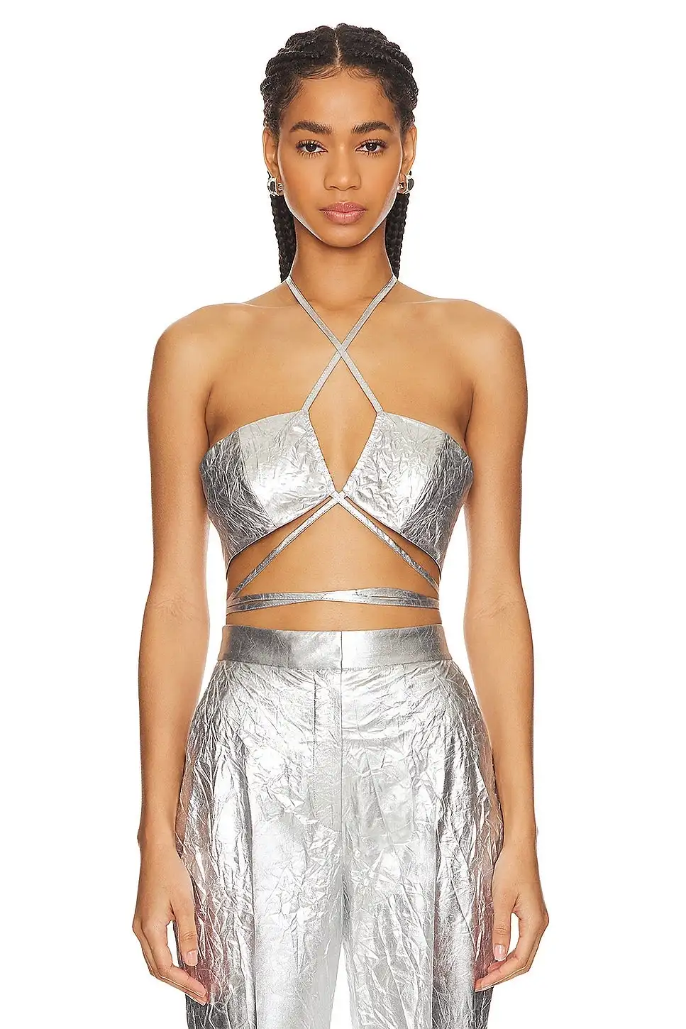 Crinkle Metallic Plunge Neck Button-up Shirt