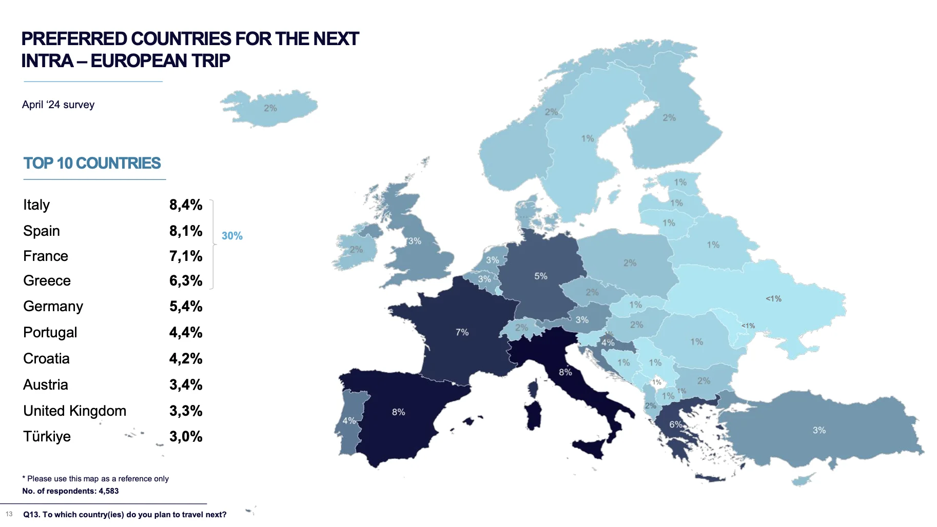 Interest in travel is up 5% compared to 2023. The survey, conducted in April 2024, questioned consumers in Germany, the United Kingdom, France, the Netherlands, Italy, Belgium, Switzerland, Spain, Poland, and Austria. It found 37% of respondents are looking at a single trip getaway, while a lucky 57% intend to go away twice or more, during the period.