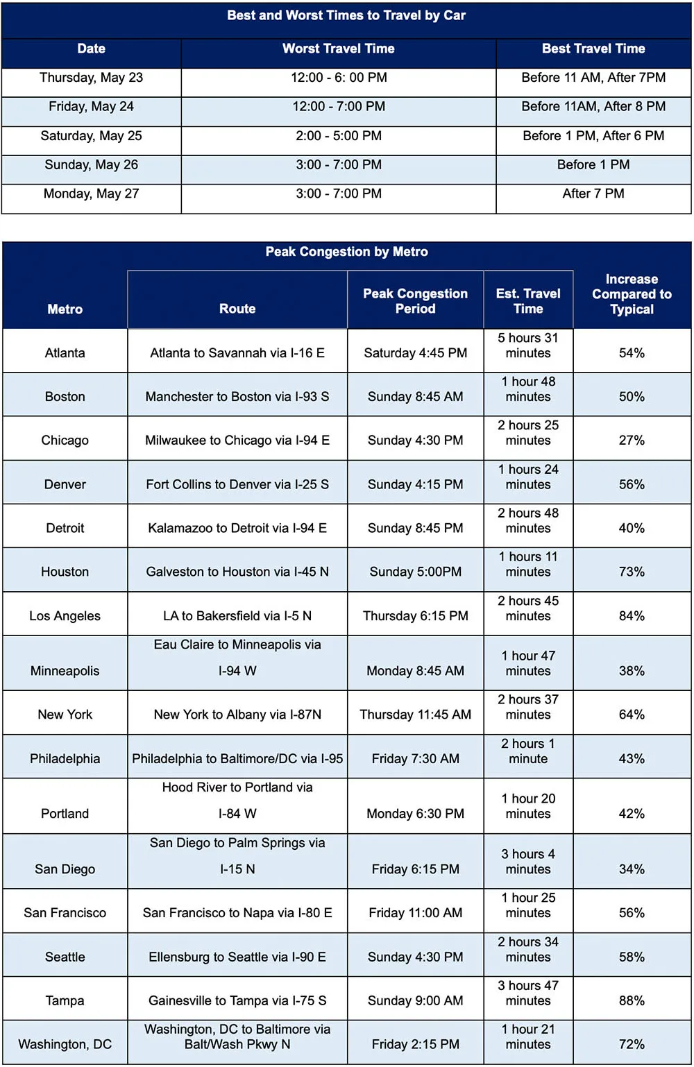 INRIX, a provider of transportation data and insights, says drivers leaving Thursday or Friday should hit the road early to avoid mixing with commuters. Travelers going back home on Sunday or Monday should avoid the afternoon hours when return trips will peak.