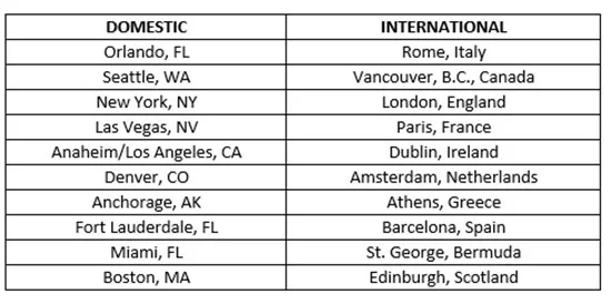 European cities dominate the international list. The top 10 domestic and international destinations below are based on AAA booking data.