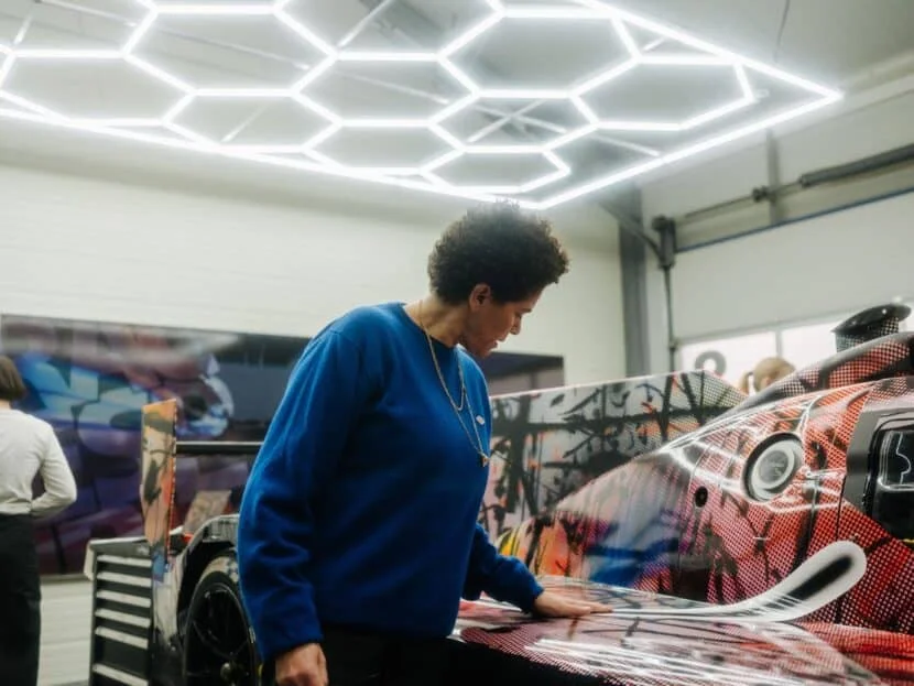 One of the main challenges Mehretu faced was the strict aerodynamic needs of a race car. Traditional painting or wrapping methods were not possible. “We couldn’t wrap the car because it will affect the aerodynamics,” Mehretu explained. This challenge required a new approach to ensure the car’s performance was not affected while adding artistic flair.