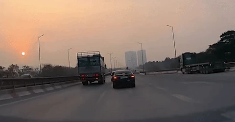 Trên cao tốc vành đai 3 đoạn qua công viên Yên Sở (Hoàng Mai, Hà Nội), một chiếc xe sedan bị đâm xoay ngang do tài xế chuyển làn đột ngột ngay trước đầu xe tải.