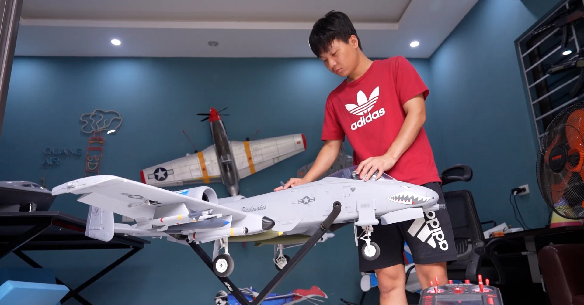 Chiếc mô hình A-10 Thunderbolt II này được trang bị hai động cơ đẩy 80mm, có sải cánh 1.7m và chiều dài thân 1.65m. Khi bay, nó có thể đạt tốc độ tối đa gần 200 km/h. Anh Quang đặc biệt ấn tượng với sự tỉ mỉ trong thiết kế của hãng, từ bộ phận càng đáp đến các chi tiết nhỏ, tất cả đều đạt tỷ lệ giống máy bay thật đến 90%, mang lại trải nghiệm chân thực nhất cho người chơi.