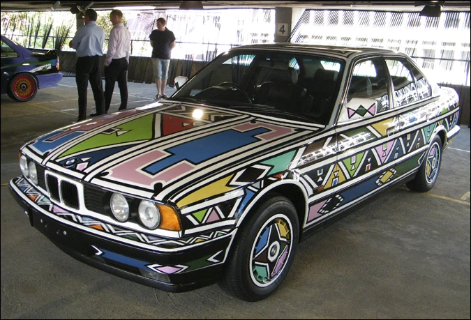 South African artist Esther Mahlangu coated the bodywork of the car in 1991 with the bright colours and clearly distinguishable ornamental shapes typical of her ethnic tribal Ndebele art.