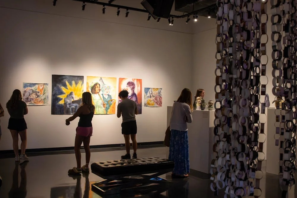 Visitors stand near Zoe Gehtland’s senior thesis on May 9. Gehtland’s project included watercolor paintings showcasing the cosplay community.