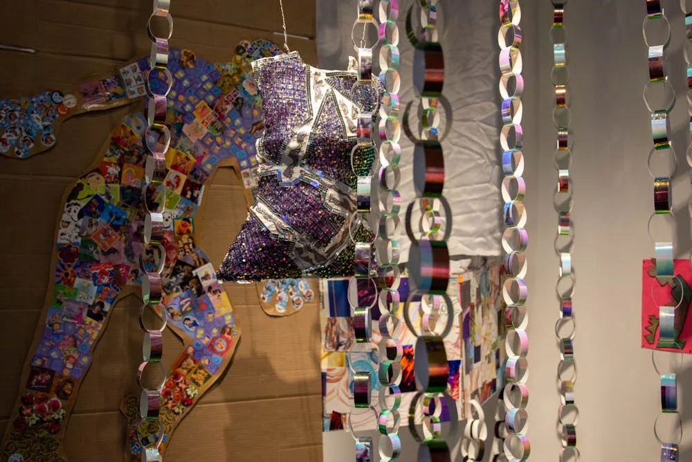 Colorful duct tape, cut-up cones, plexiglass, zip ties, a glittery mold of a human torso, paper chains and mini disco balls are just some of the many details of Jolie Patten’s senior thesis piece, which seeks to transport the viewers to a world where mundane items become extraordinary.