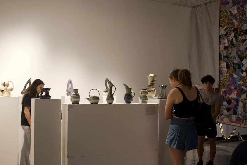 Visitors look at Delanie Rourke’s senior thesis on May 9. Her ceramic showcase wanted to highlight the push and pull of human relationship.
