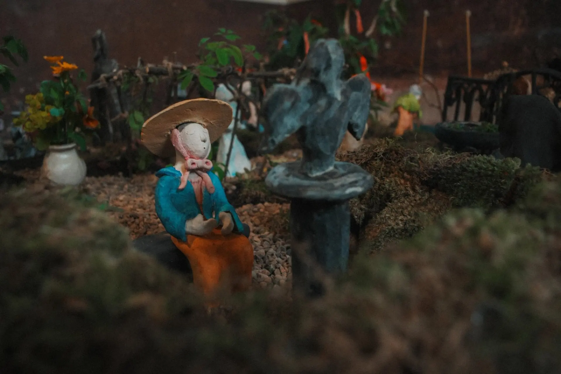 Barnie Page, who launched pop-up exhibitions in Stroud under the name Sacred Thing in 2021, co-organised a show as part of Neo Ancients together with Legion Projects. Installed in the Chapels of Rest in Stroud Cemetery, the exhibition included floral designs by Emma Thistlethwaite inspired the walled plots and pergolas of real gardens and sculpted figures and architectural remnants created by Matthew Robert Hughes.