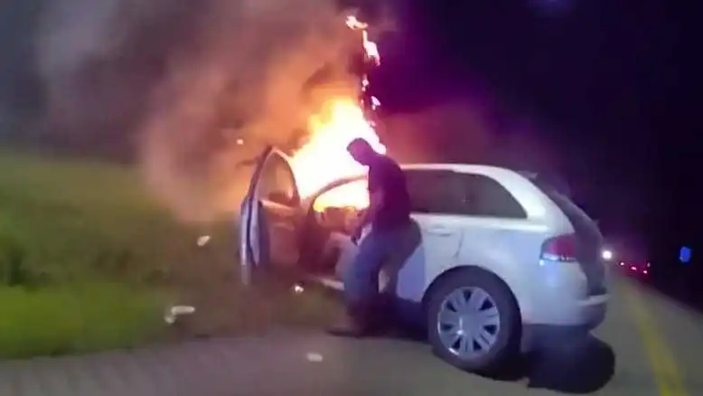A Kentucky sheriff’s deputy saved a driver from a burning car in Grayson County.On Tuesday, Grayson County Sheriff’s Deputy Thomas Lane responded to the call of a car fire at the intersection of Shrewsbury and Schoolhouse roads. Police said the car had flames coming out of the engine. That’s when a nearby bystander told police that there was still someone in the car. It is unknown if the driver was trapped in the car, but when Lane ran to the car and opened the door the driver appeared to be in a “dazed state of mind,” said police. Lane then pulled the driver out of the car, with the help of a bystander. “With no regard for his own safety, Dep. Lane acted courageously immediately upon his arrival at the scene. It appeared from the video that the man refused to exit the burning car when coaxed by the citizens,” said Sheriff Norman Chaffins. “Minutes matter when our police respond to these types of calls. Had Dep. Lane arrived or hesitated a couple of minutes later than what he did, the next car arriving on scene would probably have been the County Coroner! We are truly blessed to have Thomas serving the community in which he was raised!”The driver was treated for minor injuries, but no major injuries were reported from the fire. The collision is still under investigation by the Grayson County Sheriff’s Office.