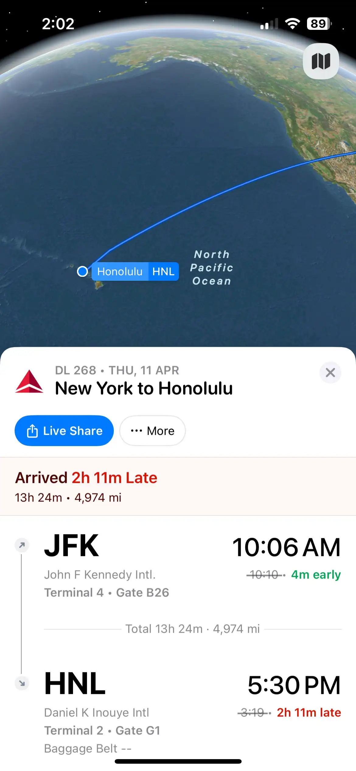However, I have found that Flighty isn’t perfect at tracking delays. A recent long-haul flight between New York’s John F. Kennedy International Airport (JFK) and Honolulu’s Daniel K. Inouye International Airport (HNL) was delayed nearly three hours, with nary a notification from Flighty.