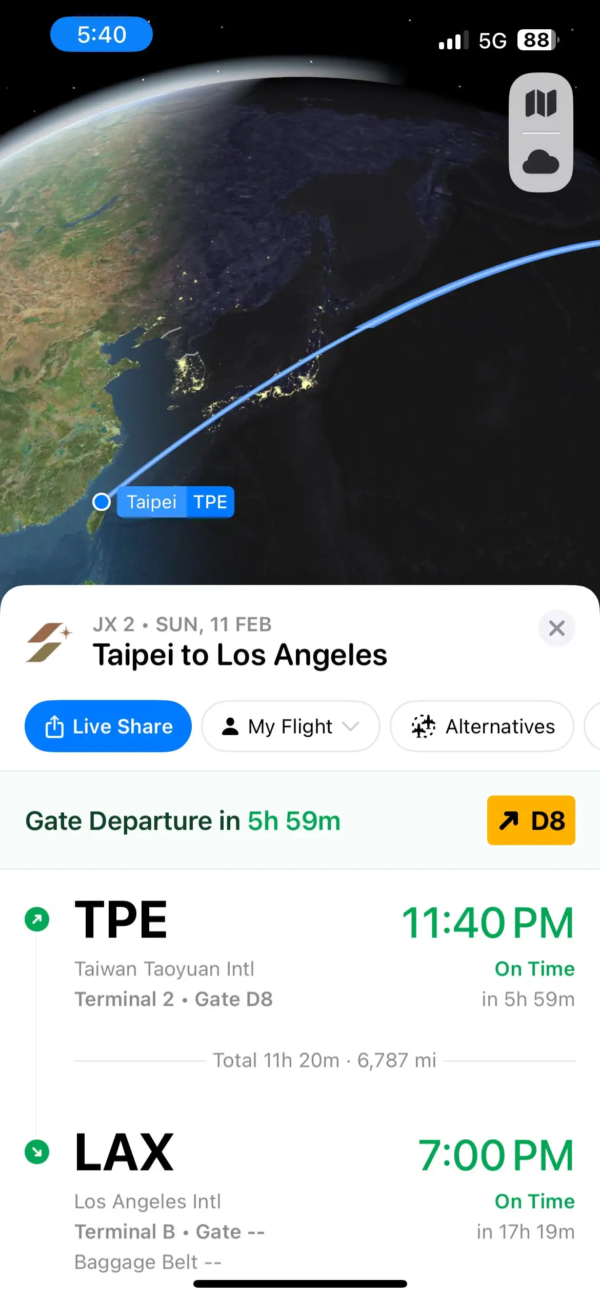 Flighty lets you know which gate you are leaving from or arriving at, as well as any gate changes that occur on the day of travel. The app is also a frequent presence while you are on a flight. It will let you know if your flight is on time and how long you have left on the flight.