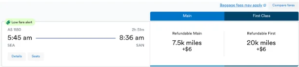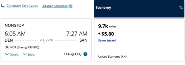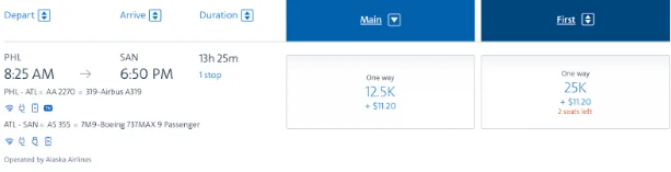 Maybe you’re a fan of collecting American Airlines miles. Flights from the East Coast can be found for as few as 12,500 miles one way in economy or 25,000 miles one way in first class, like this example of an AAdvantage miles award flight from Philadelphia to San Diego.
