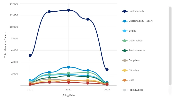 GlobalData’s apparel company filings data revealed that sustainability is still a dominant theme in the apparel sector. The keyword continues to weigh highly from May 2023 until 2024 with a total of 2,730 mentions this year.