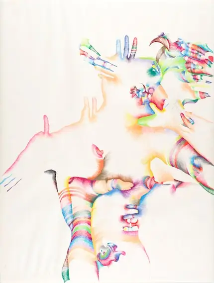 Marisol’s drawings with colored pencil, felt-tip pen and collage are also distinctive. They often use a full rainbow of color to define the external contours of the figures, while leaving most of the space open and empty. These pulsing, vibrating colors imply a kind of force field surrounding their subject, perhaps of electromagnetic or psychoactive origin, suggesting but not proving a connection to the psychedelic hippie culture of the day.
