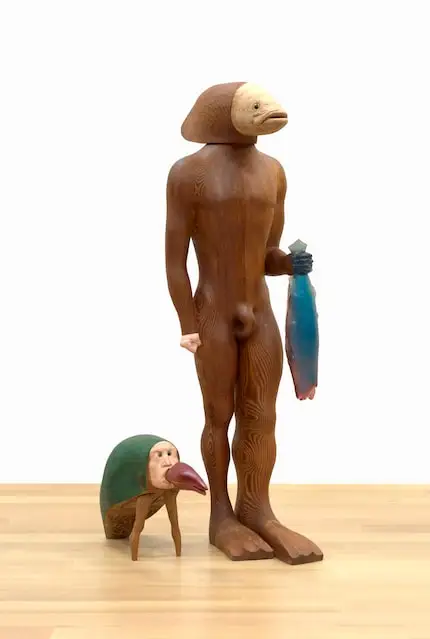 The resulting assemblage has a kind of hybrid or disjunctive character that keeps the viewer somewhat off-balance. A single sculpture, for instance, might have a detailed, realistically carved face and hands, a cartoonishly simple or even unfinished body and accessories, such as a park bench, bicycle or umbrella that were made in a factory and appropriated by the artist.