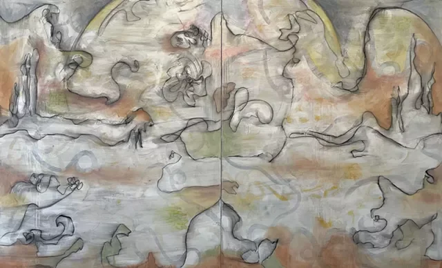 Lisitano is graduating from VTSU with a body of abstract paintings reflective of her multifaceted experience. In works such as “La Fantasia della Mia Summerland (the fantasy of my summerland),” she layers paint with drawing mediums to build up a dreamy palimpsest of a surface. Its terra-cotta, yellow and gray palette is reminiscent of Italy. Her lines suggest incomplete memories of figures, buildings, landscapes. At 5 by 8 feet, the painting recalls a fresco.
