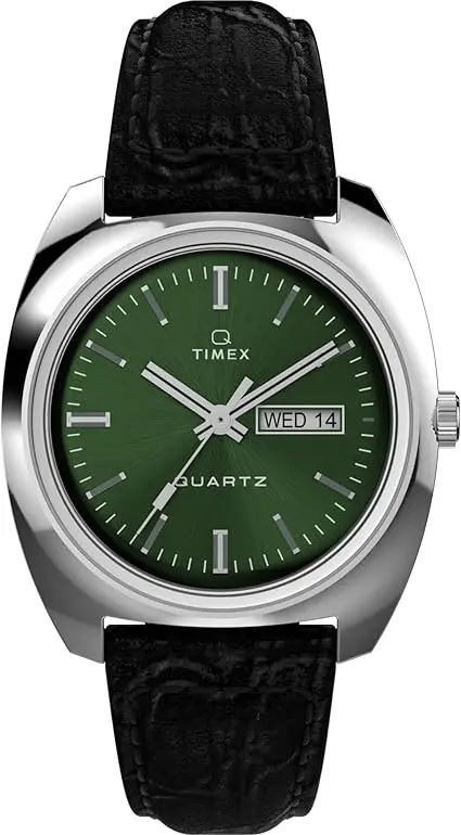 Timex Men’s Q 1978 Day/Date 37mm Watch – Black Strap Green Dial Stainless Steel Case