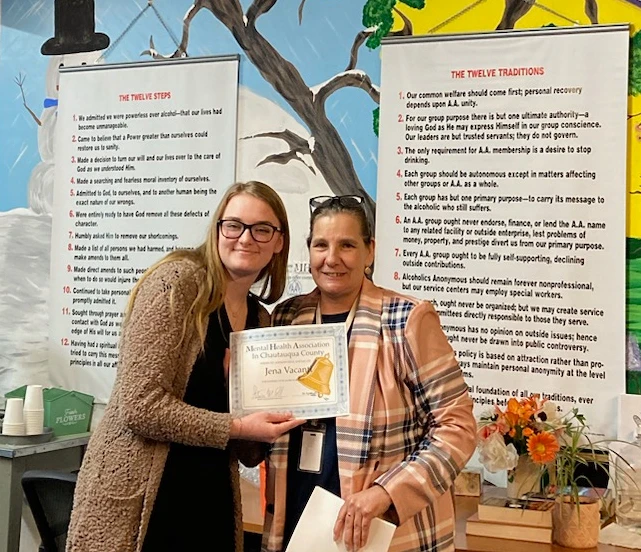 Finance Director Jill Marsh opened the April recovery luncheon of the Mental Health Association in Chautauqua County by recognizing Jena Vacanti, who is completing her internship at MHA through Jamestown Community College’s Occupational Therapy Assistant (OTA) program.