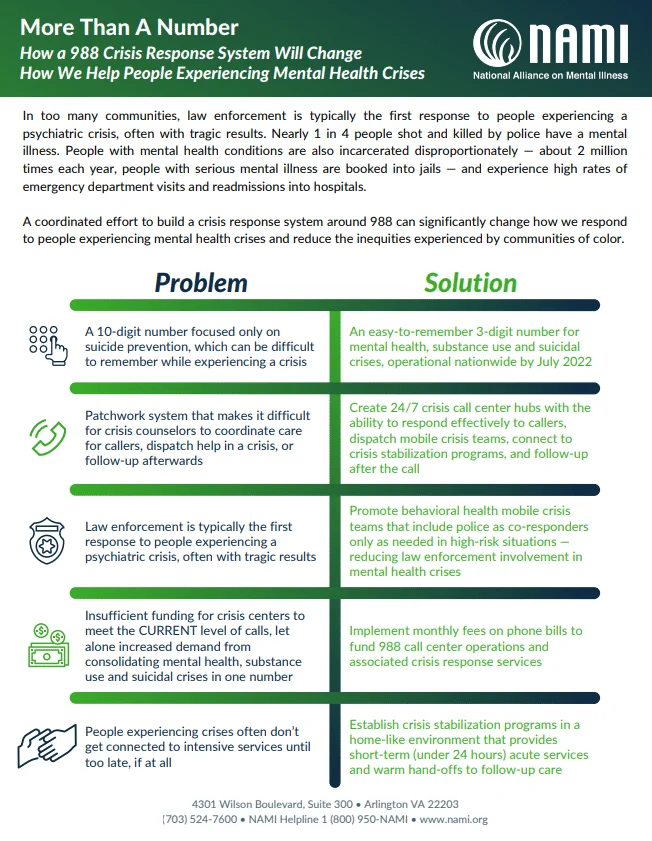 This chart from the National Alliance on Mental Illness demonstrates problems that exist and how 988 offers solutions that coordinate with crisis care programs and services.