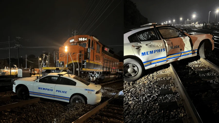 MEMPHIS, Tenn. — While Memphis Police were searching for suspects in South Memphis Wednesday night, an officer’s squad car got struck by a train.