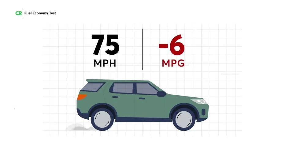 Consumer Reports’ tests show you lose about six miles per gallon at 75 instead of 65 miles per hour.