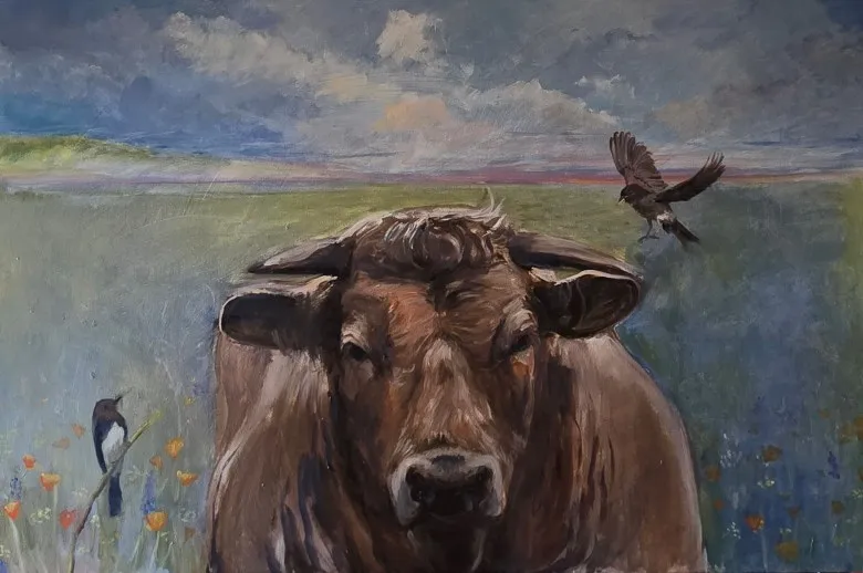 “It was right before the annual rodeo and posters and fliers were everywhere about the cattle drive. Hence, the cow,” she told me. “As an artist, I wanted to capture how big and imposing they are, but their faces are so soft and sweet. I added Black Phoebes because they are always darting around when I walk or bike around the Tri-Valley area.”
