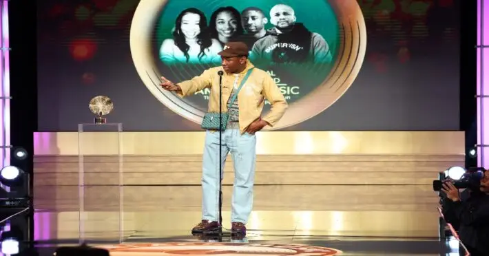 At this point in his career, Tyler certainly has a style that works best for him. While accepting an award at the Black Music Action Coalition Music in Action Awards Gala, Tyler wore his signature light wash jeans, cardigan, and loafers. He topped it off with yellow jacket and green Louis Vuitton bag to support his mellow aesthetic.
