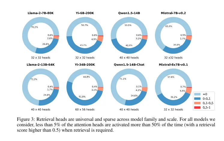The methodology involved conducting detailed experiments across several prominent models such as LLaMA, Yi, QWen, and Mistral. Researchers applied the Needle-in-a-Haystack test, embedding specific pieces of information within large text blocks to measure the precision and effectiveness of retrieval heads. The study meticulously assessed the activation patterns of these heads under various experimental conditions, including different model scales and fine-tuning states, to determine their impact on performance and error rates. This systematic testing helped establish a quantitative basis for the significance of retrieval heads in improving accuracy and reducing hallucinations in language processing tasks.