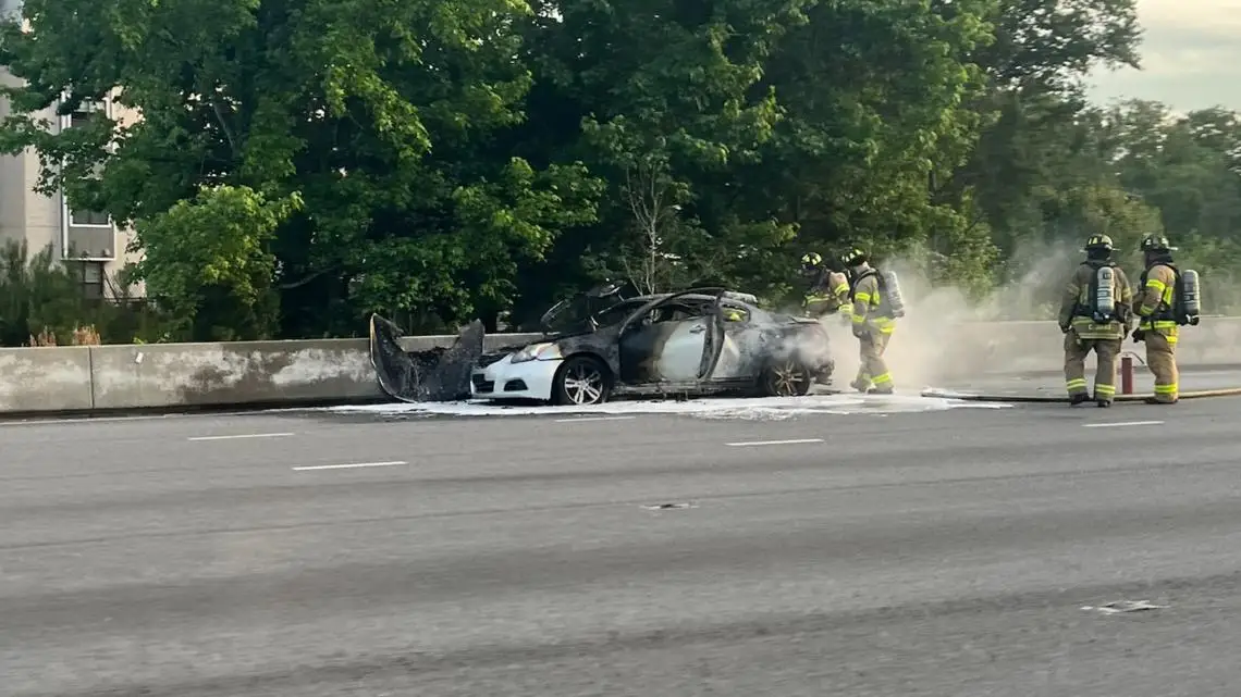 Firefighters arrived to find the vehicle fully engulfed in flames. A man, woman, and child all got out of the car safely. No one was hurt.