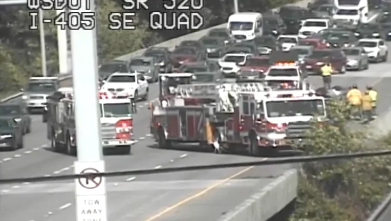 Washington State Department of Transportation traffic cams showed a huge response from first responders. Fire trucks blocked the three leftmost lanes, and crews were seen approaching a turned-over vehicle.