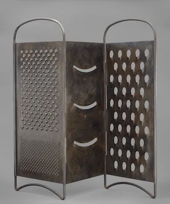 On first encountering Mona Hatoum’s work, Grater Divide, from 2002, the gigantic cheese grater struck me as a delightful piece of whimsy. But Hatoum uses the everyday kitchen item as a symbol of the walls that divide and separate people, at times stirring up violence between people of different backgrounds or beliefs. Hatoum’s back story is significant: she was born in Beirut after her parents fled from their home in Palestine in 1948; in 1975, Hatoum was exiled in London when war erupted in Lebanon. She uses the walls and divisions of this sculpture to express her personal experience of displacement.