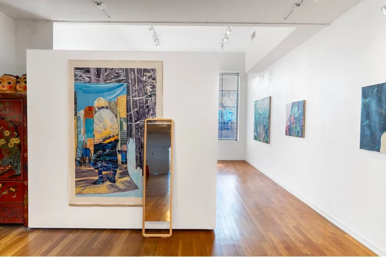 What makes a person? Nature and nurture both, surely, but also place. Some of the people portrayed in “Looking Out,” a solo show of paintings by Shanghai-born Jiaming You, recently on view at the Chinese American Museum of Chicago, illustrate this. They gaze at all sorts of landscapes—at the sunset, greenhouse flora, the skyline, a forest of trees—while reflecting others on the surfaces of their bodies. An urban woman’s silhouette is filled with a sunrise over the lake; the clothes of a child on a wintry bus are patterned with images of somewhere tropical. These geographies are felt in the layers that comprise our complex selves, magicked into visibility by the artist’s brush. In two standalone works, the effect is achieved through literal incorporation: a full-length mirror propped up against Viewfinder reflects the viewer and the library at the rear of the gallery. One Hundred Years and a Second, printed on vinyl and applied to the gallery’s front windows, allows the young women pictured to look outside, under the very real sky above.