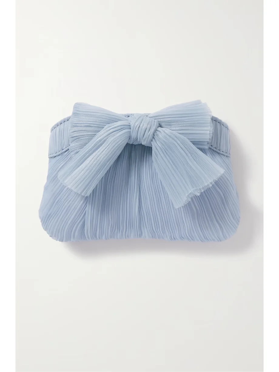 Find these colors across Bridgerton-esque clothing pieces like lace bustiers, floral-embroidered skirts, and bow-tied slip dresses. You can also spot the cool-toned colorways on many summer accessories, like the pleated bow-adorned clutch that we could see Daphne, Eloise, or Francesca holding today.