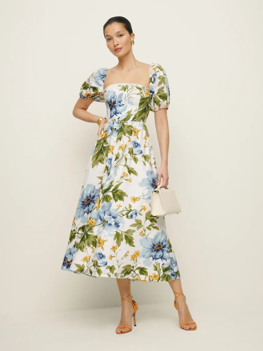 Milkmaid dresses, for instance, are a current spring 2024 dress trend that we see gaining popularity into the hotter months. Their signature square necklines, bow fastenings, puff sleeves, and smocked or boned bodices are similar to those worn in the series. You could also slip into any elegant puff-sleeve dress or Bridgerton-inspired nap dress. And rather than heavy taffetas and floral brocades, opt for breezy linen or cotton styles in floral prints.