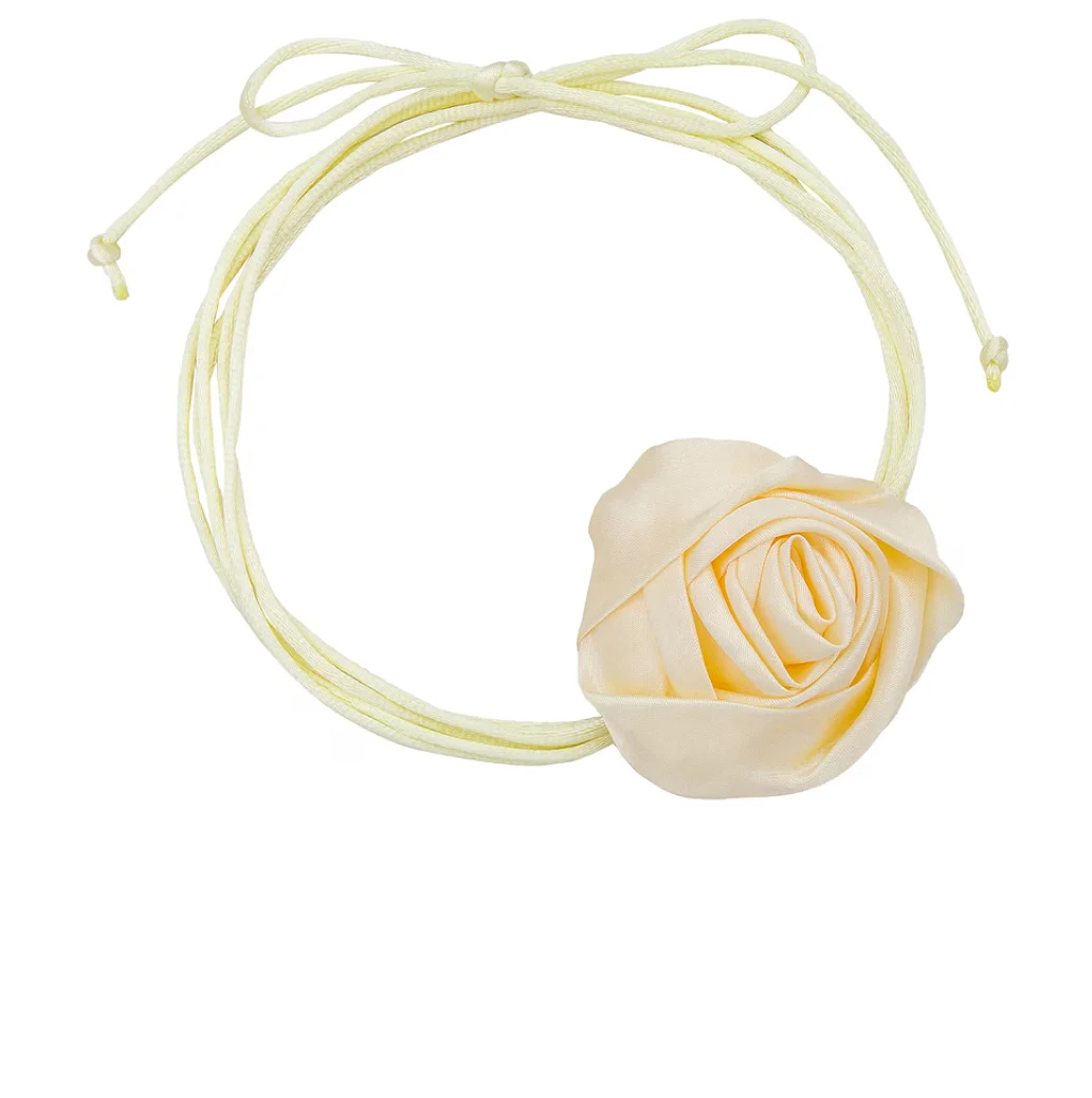 Beyond appearing on dresses, flowers found their way onto jewelry in the form of rosette pieces, including statement earrings and wrap-around chokers.