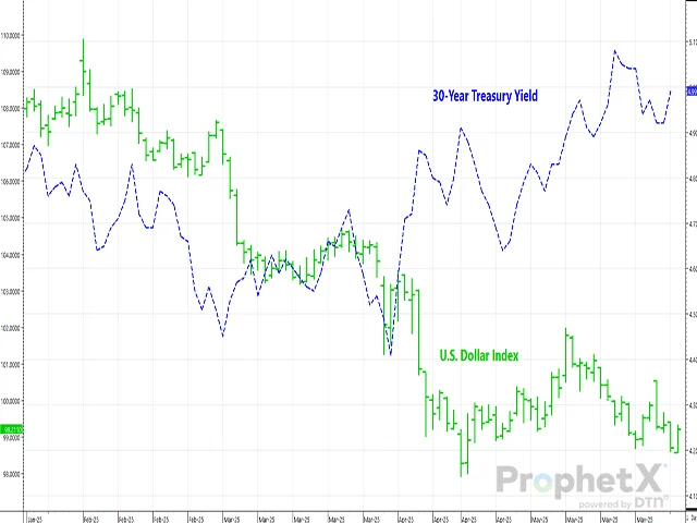 The dollar had been strong when President Donald Trump was elected — “All Bow Before the Almighty US Dollar” was the headline on a DTN piece of mine last December (https://www.dtnpf.com/…) — and it strengthened further through mid-January (https://www.dtnpf.com/…). The greenback began its downward trend once investors realized he was serious about big tariffs, which investors see portending slower economic growth and higher inflation.